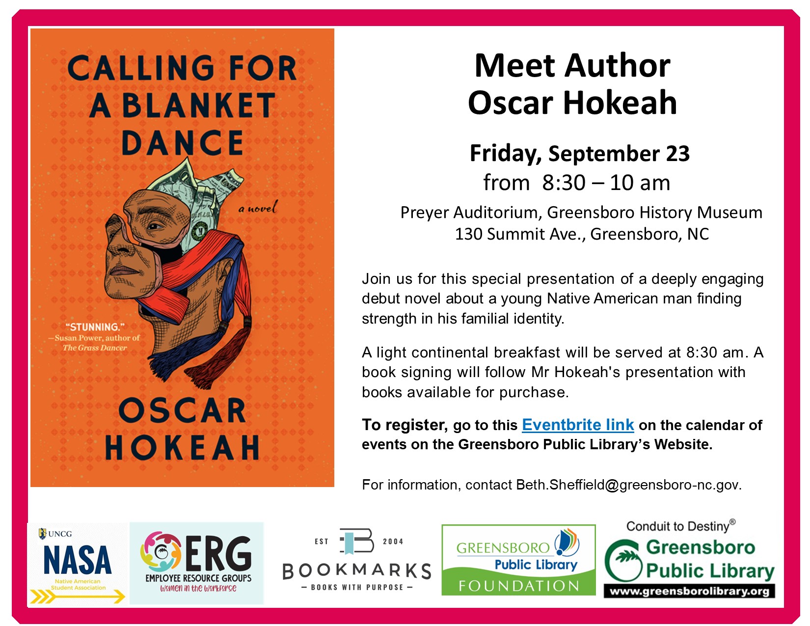 Join the Greensboro Public Library for this special presentation with author Oscar Hokeah starting with a light continental breakfast served at 8:30 am. Told in a series of voices, Calling for a Blanket Dance takes us into the life of Ever Geimausaddle through the perspectives of his family as they face myriad obstacles. His father’s injury at the hands of corrupt police, his mother’s struggle to hold on to her job and care for her husband, the constant resettlement of the family, and the legacy of centuries of injustice all intensify Ever’s bottled-up rage.